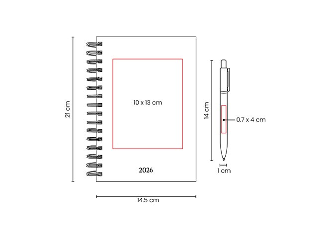 AREA: 10 x 13 cm Agenda / 0.7 x 4 cm Bolígrafo