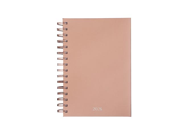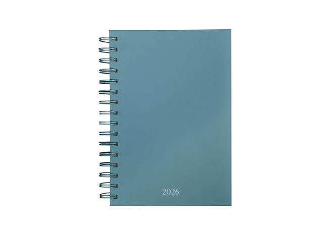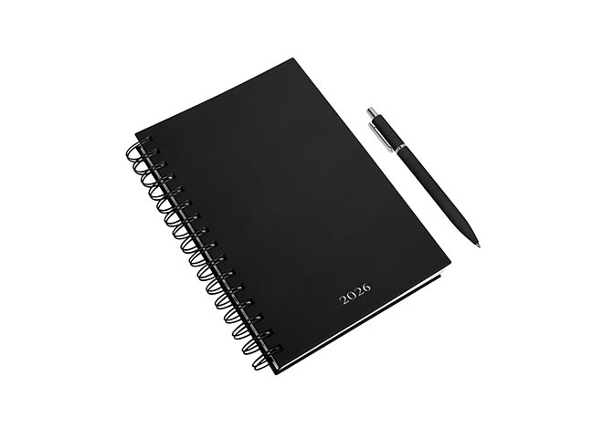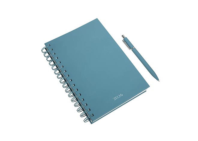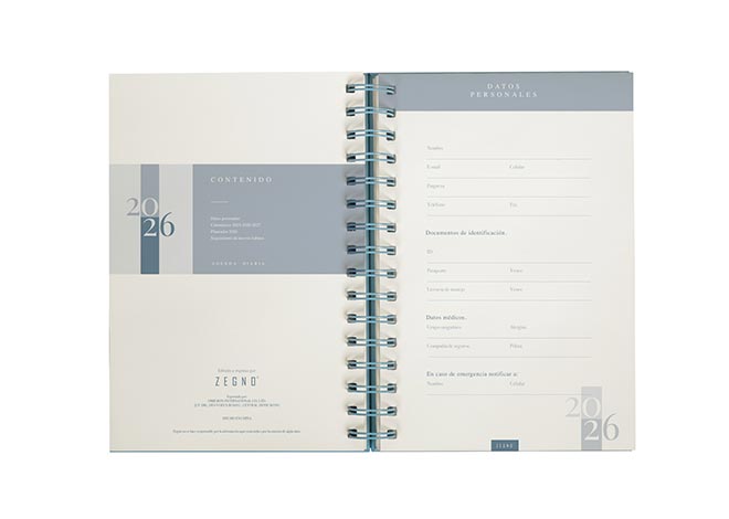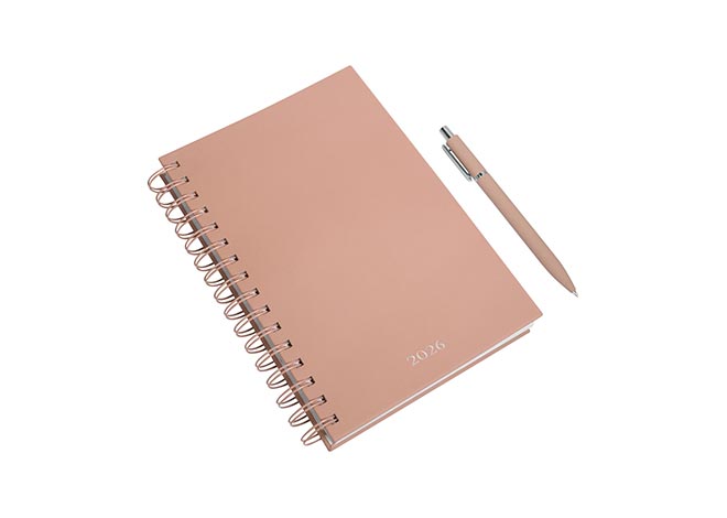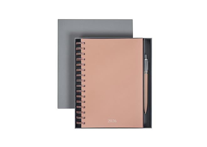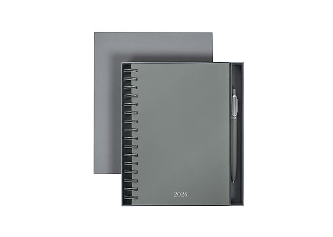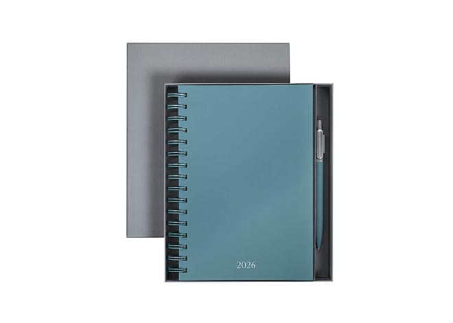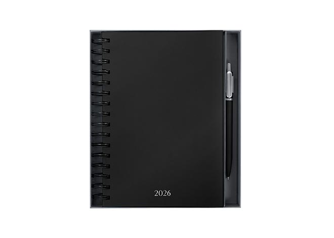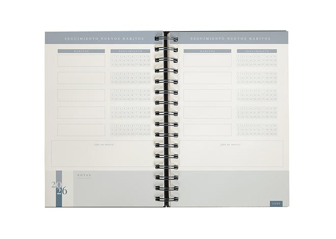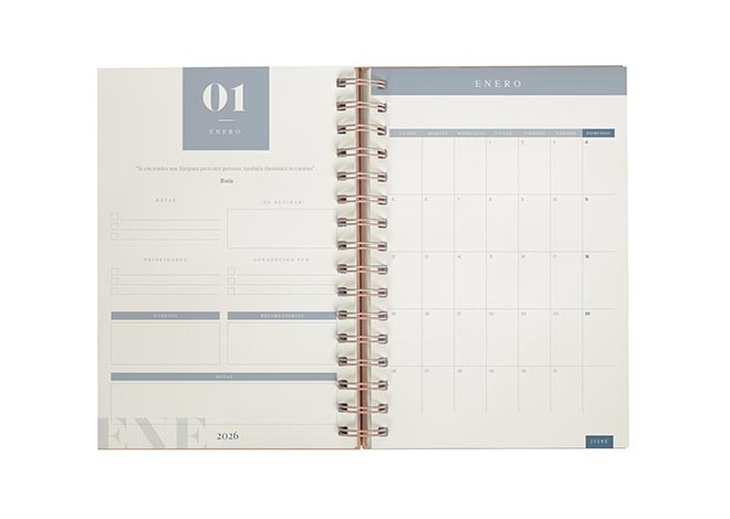Descripción: Agenda diaria con 174 hojas. Contiene datos personales, calendarios 2025-2026-2027, planeador 2026 y seguimiento de nuevos hábitos. Incluye bolígrafo metálico y caja individual tipo regalo.