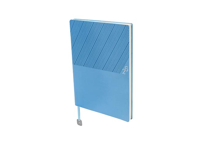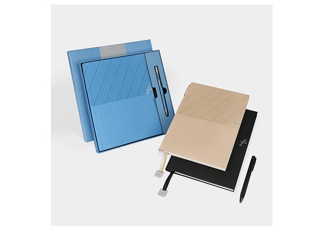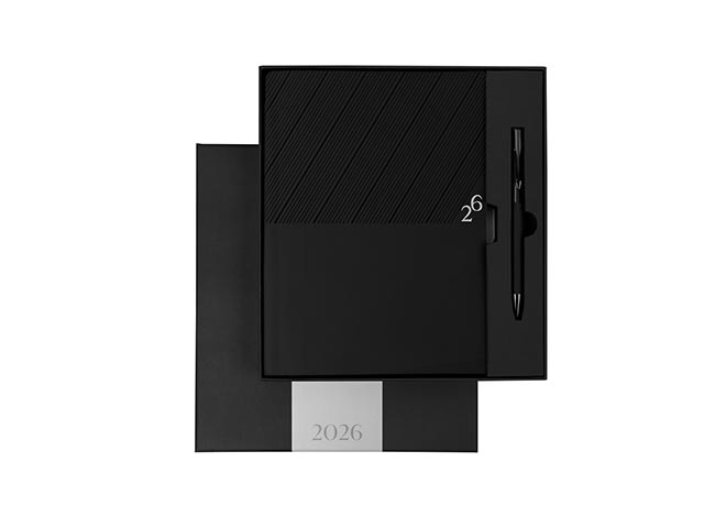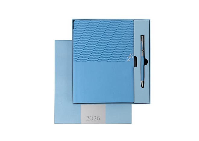 Descripción: Agenda semanal con 100 hojas. Contiene datos personales, calendarios 2025-2026-2027, planeador 2026, presupuesto de gastos, seguimiento de nuevos hábitos, organizador de tareas y planeador de proyecto. Incluye caja individual del mismo color a la agenda, separador con placa metálica y bolígrafo.