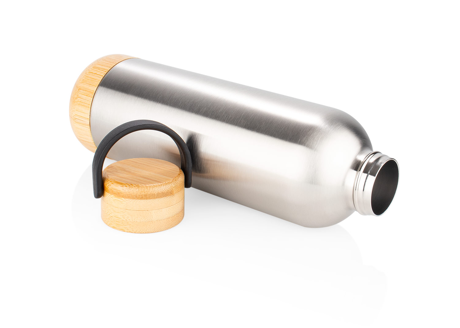 Botella fabricada en acero inoxidable con acabado cromado, tapa de cierre giratorio con detalle en madera y asa para facilitar el transporte. Su diseño elegante y funcional la hace ideal para acompañarte en tu rutina diaria, permitiendo llevar diferentes tipos de bebidas de forma práctica y segura. Capacidad: 600 ml / 20 Oz.