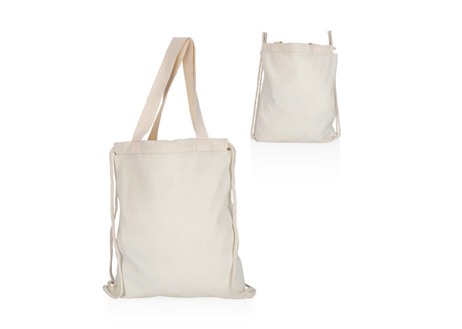 Bolsa tipo tote elaborada en algodón, con asas para llevar al hombro o en la mano. Incluye cordón para mayor seguridad del contenido. Su diseño práctico y versátil lo hace ideal para uso diario, compras o actividades al aire libre.