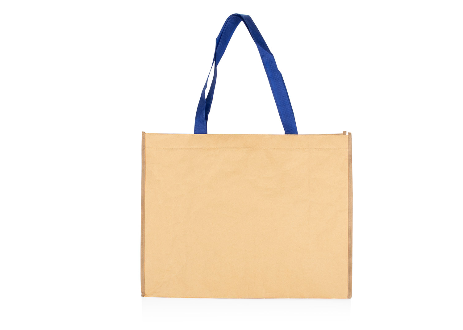 Bolso tipo tote fabricado en tela no tejida compuesta de papel kraft, con mangos en tela no tejida de 80 g/m². Cuenta con un compartimento principal abierto, ideal para llevar documentos, compras o artículos personales. Su diseño es simple, espacioso y amigable con el medio ambiente.