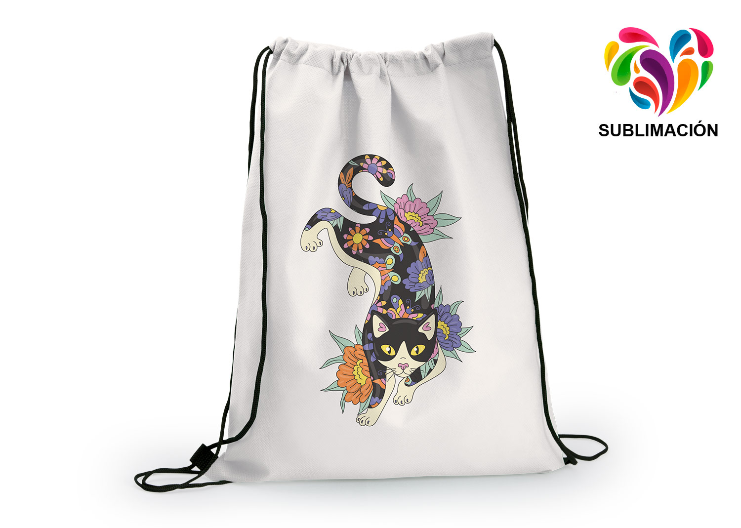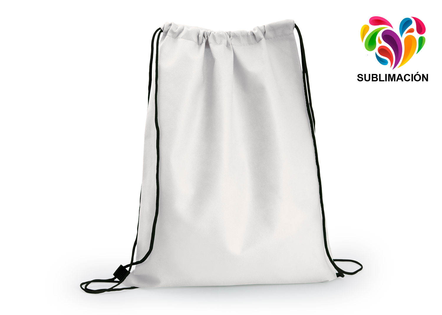 Mochila tipo saco en kambrel PET no tejido de 80 gr, apta para sublimación, ideal para personalización con diseños o logos. Ligera, práctica y resistente, perfecta para eventos, promociones o uso diario.