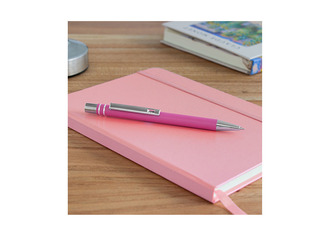 Bolígrafo retráctil. Tinta gel. Cuerpo metálico en diferentes colores acabado mate. Clip metálico, puntera y pulsador metálicos.