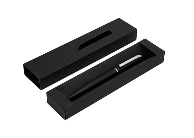 Bolígrafo con apertura giratoria. Cuerpo metálico en negro mate. Cuerpo de aluminio reciclado. Destape electroplateado en la parte superior. Recarga metálica. Clip y anillos metálicos color plata.