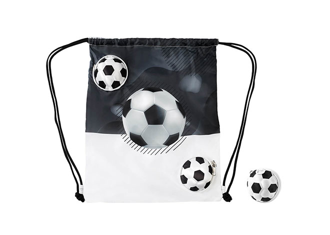Descripción: Practica, ligera y con cierre de jareta, esta mochila es perfecta para acompañarte a cualquier aventura. Su diseño se guarda por completo dentro de un estuche con cierre en forma de balón, lo que la convierte en un accesorio compacto y divertido. La figura de balón incluye un aro con gancho, que lo hace fácil de colgar o transportar. Ideal para llevar al entrenamiento, a la escuela o como regalo para amantes del futbol.