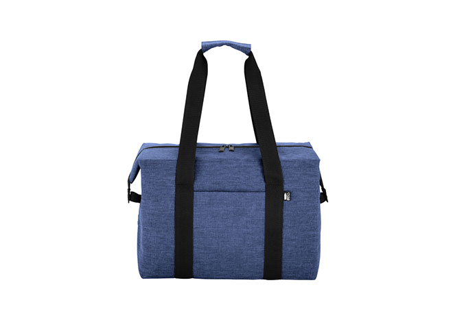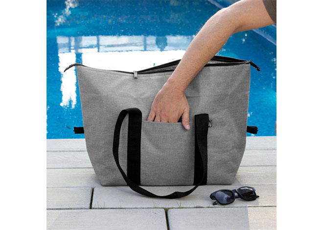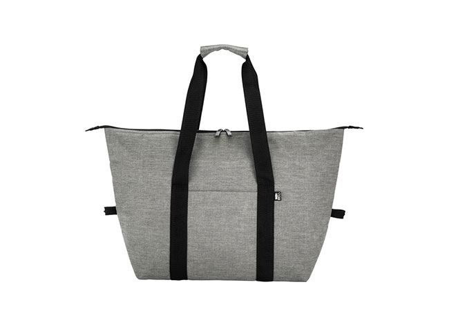 Bolso térmico. Cierre posterior con dos tiradores. Hebillas metálicas en los laterales que permiten cambiar su formato a prisma. Bolsillo frontal. Dos asas con refuerzo de velcro.