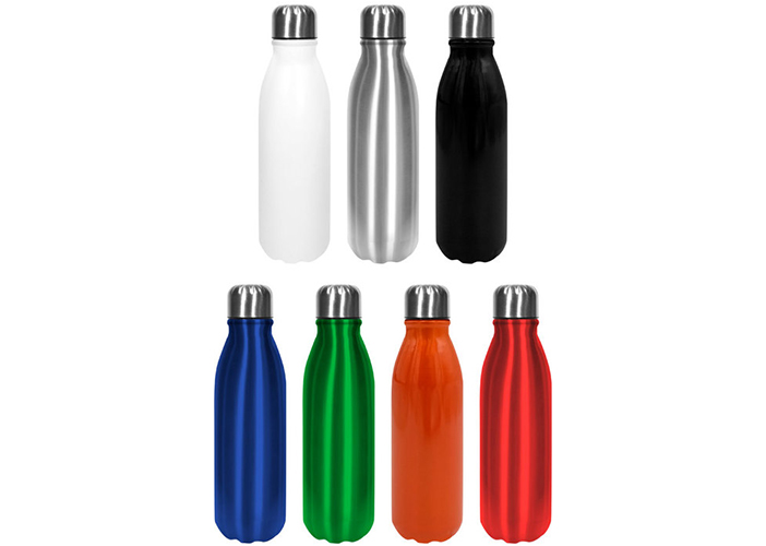 Botellas de aluminio con diferentes colores en su exterior. Tapa a rosca de color plata. Capacidad 550 ml