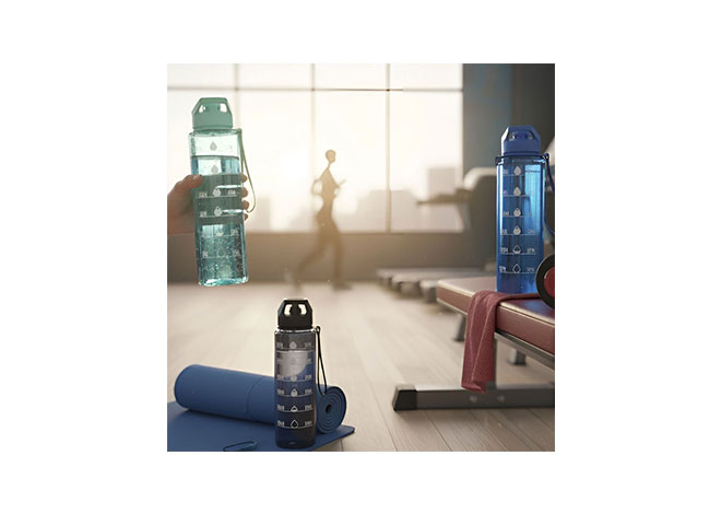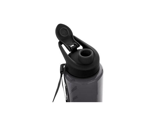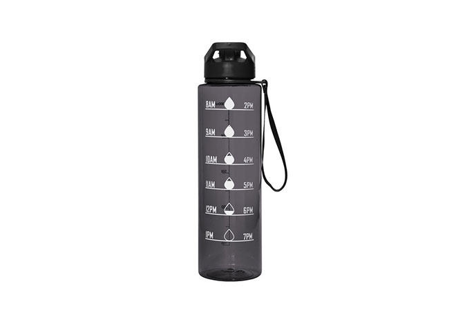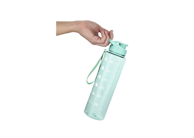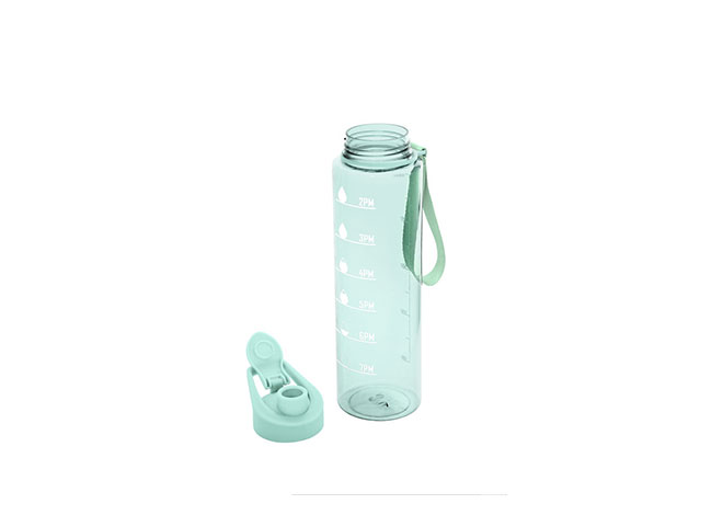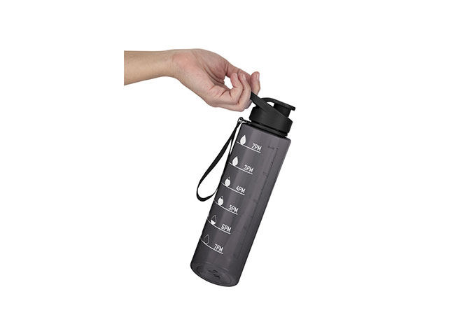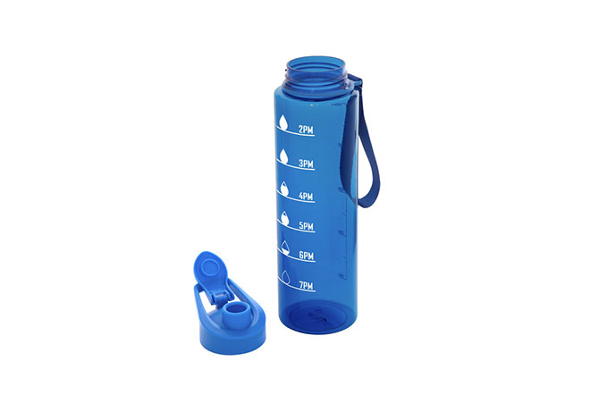 Botella con marcador de tiempo y medida. Color translúcido con tapa plástica flip top con asa, boquilla y correa del mismo color de la botella.