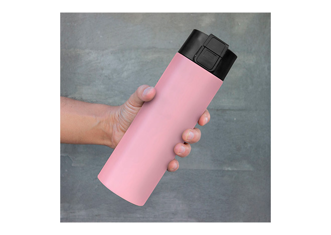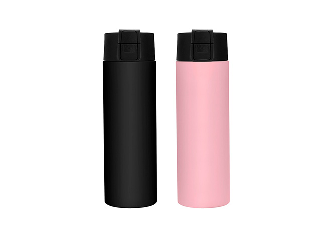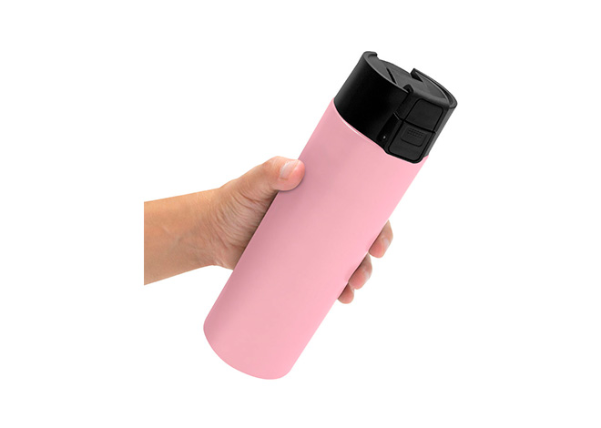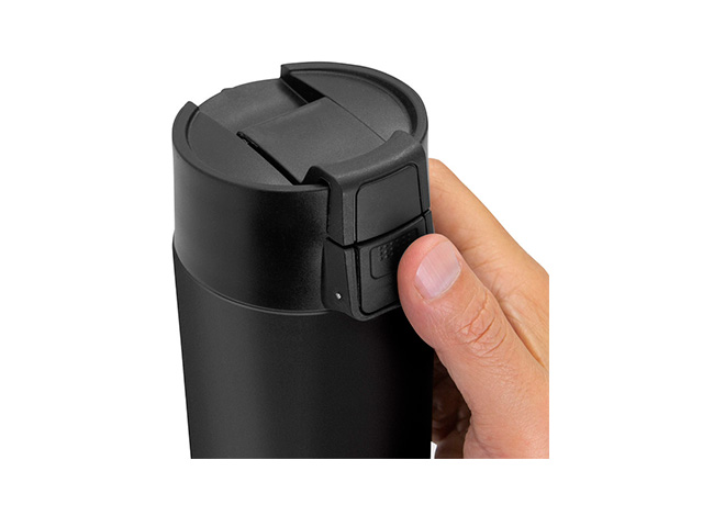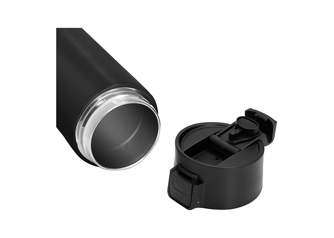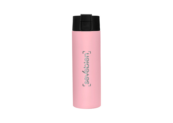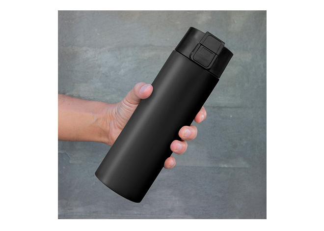 Ø 7 cm x 23 cm. Acero inoxidable. Capacidad 450 ml. Botella con aislamiento térmico vacuum. Interior de acero 304 y exterior de acero 201. Pintura acabado mate. Tapa en PP con traba de seguridad y botón pulsador de apertura. Mantiene por más de 12 hs la temperatura de las bebidas calientes y 24 hs de las bebidas frías. Presentación en caja de regalo kraft.
