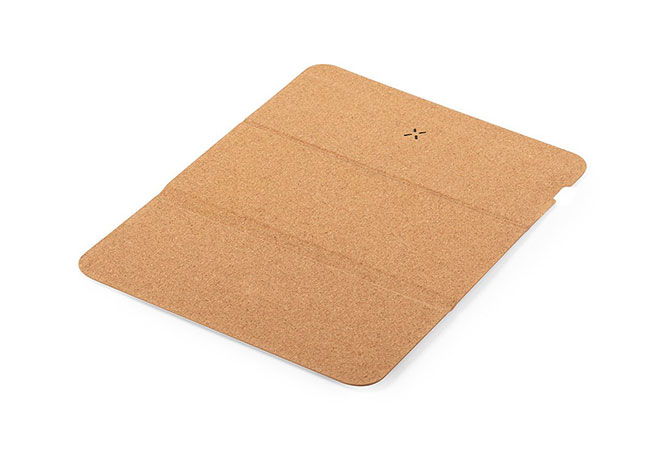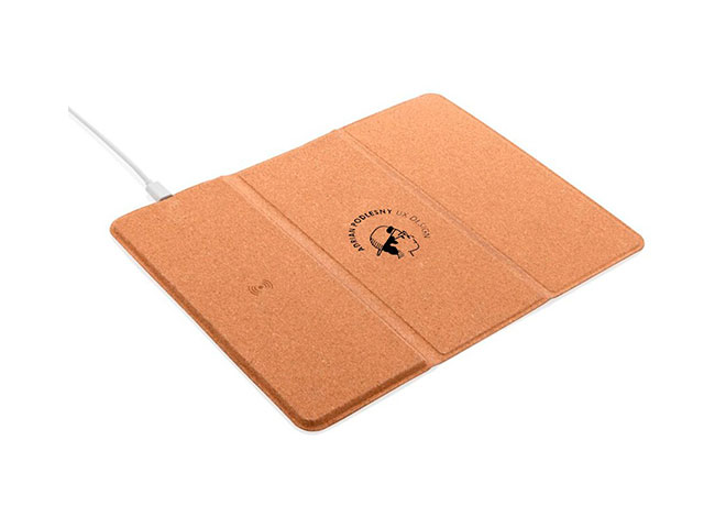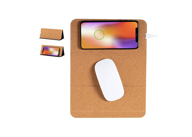 Mouse Pad en corcho natural Con cargador inalámbrico de 10W, base antideslizante y soporte para móvil olegable de 3 cuerpos. ncluye cable tipo C.