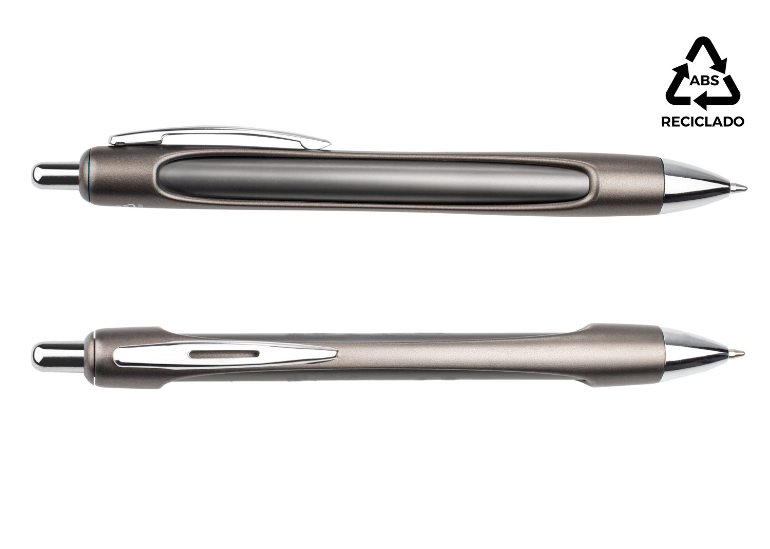 Bolígrafo de acción retráctil con diseño metálico y materiales reciclados. Cuerpo exterior en ABS reciclado con acabado metálico, interior de aluminio reciclado. Clip, botón y punta cromados. Incluye recambio tipo Parker de plástico. (Bolígrafo/Esfero)