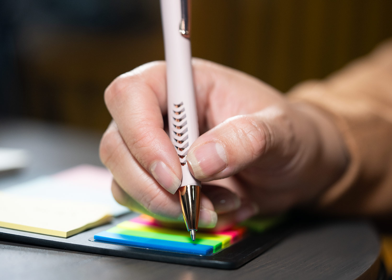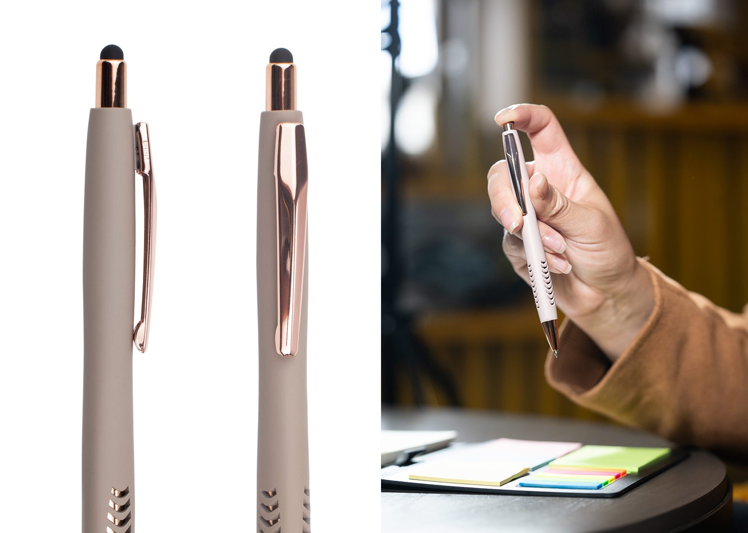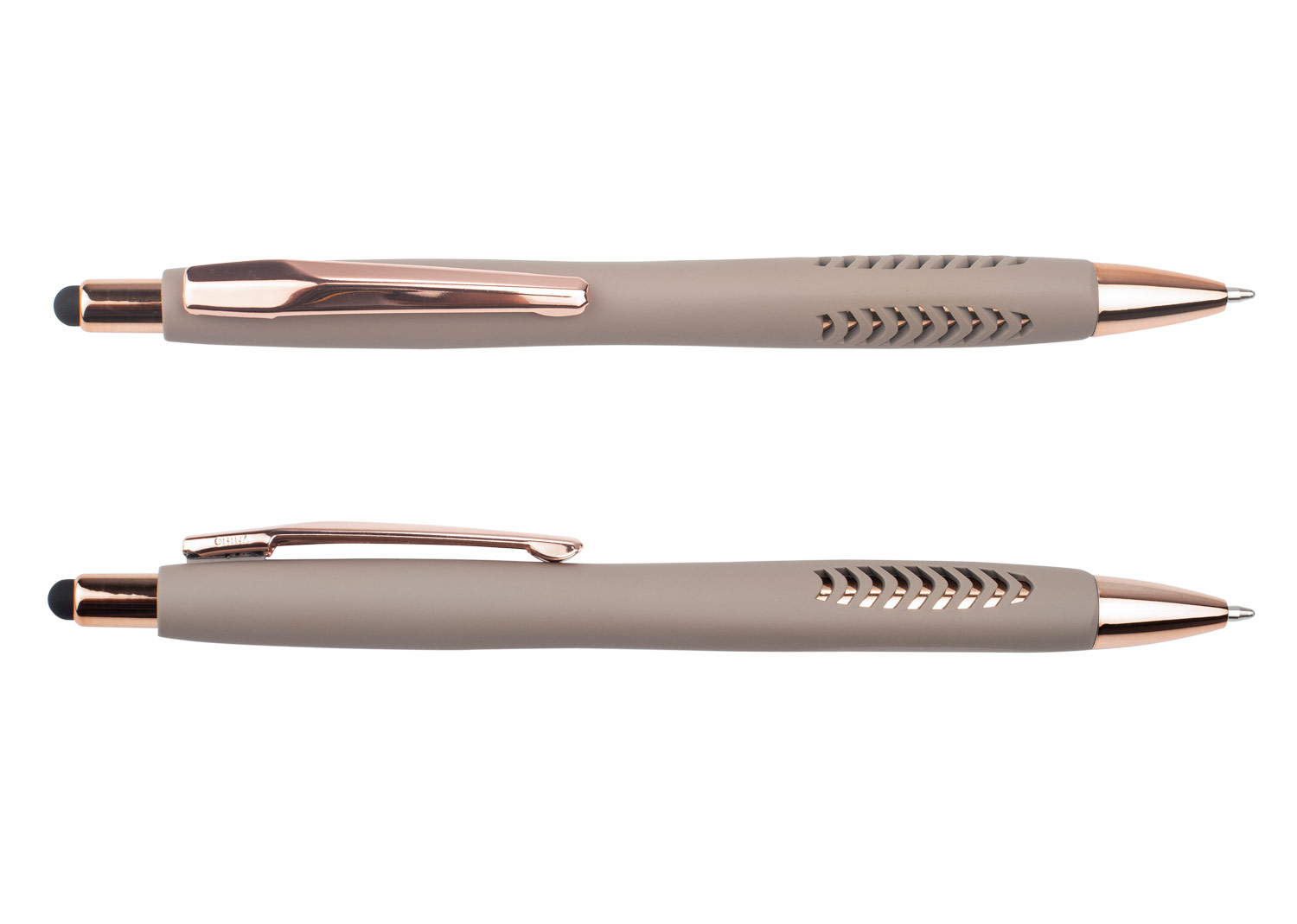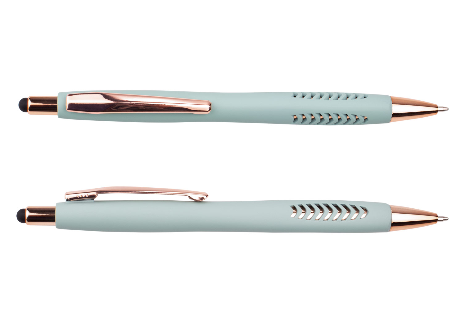 Bolígrafo con cuerpo de color sólido mate, suave al tacto, diseño sofisticado. Detalles metalizados rosa. Sistema de apertura retráctil con stylus para pantallas táctiles. En la parte inferior, contiene 2 detalles con hundimiento en forma de punta de flecha. (Bolígrafo/Esfero)