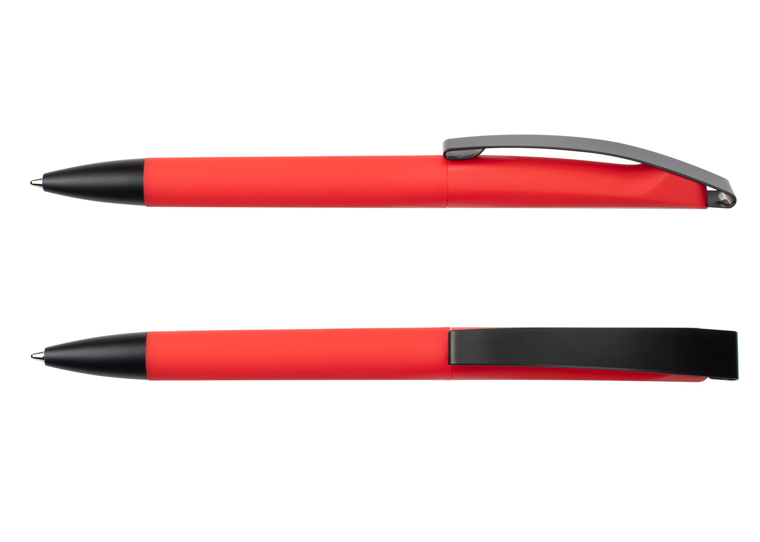 Bolígrafo con cuerpo en plástico ABS y barril engomado de color, que ofrece un agarre cómodo y seguro. Su punta negra mate aporta un acabado moderno, mientras que el clip de metal negro con base cromada permite sujetarlo fácilmente a cuadernos, bolsillos o carpetas. Ideal para uso diario en entornos laborales o académicos.