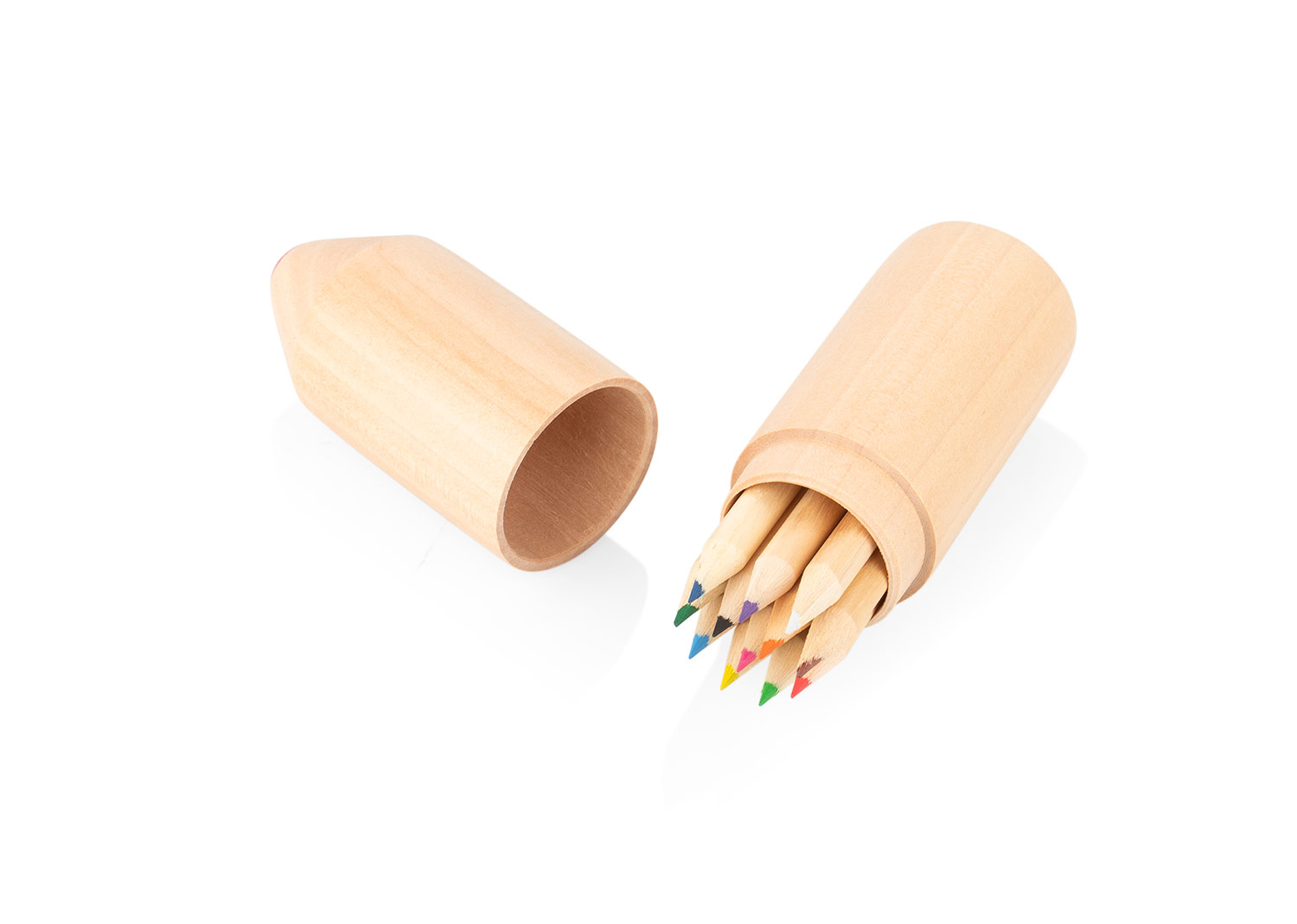 Este juego incluye 12 lápices de colores (8,7 X Ø 0,3) presentados en una caja de madera, ideal para mantenerlos organizados y protegidos. Su formato compacto facilita el transporte y almacenamiento, ofreciendo una solución práctica para actividades creativas dentro y fuera del entorno laboral.