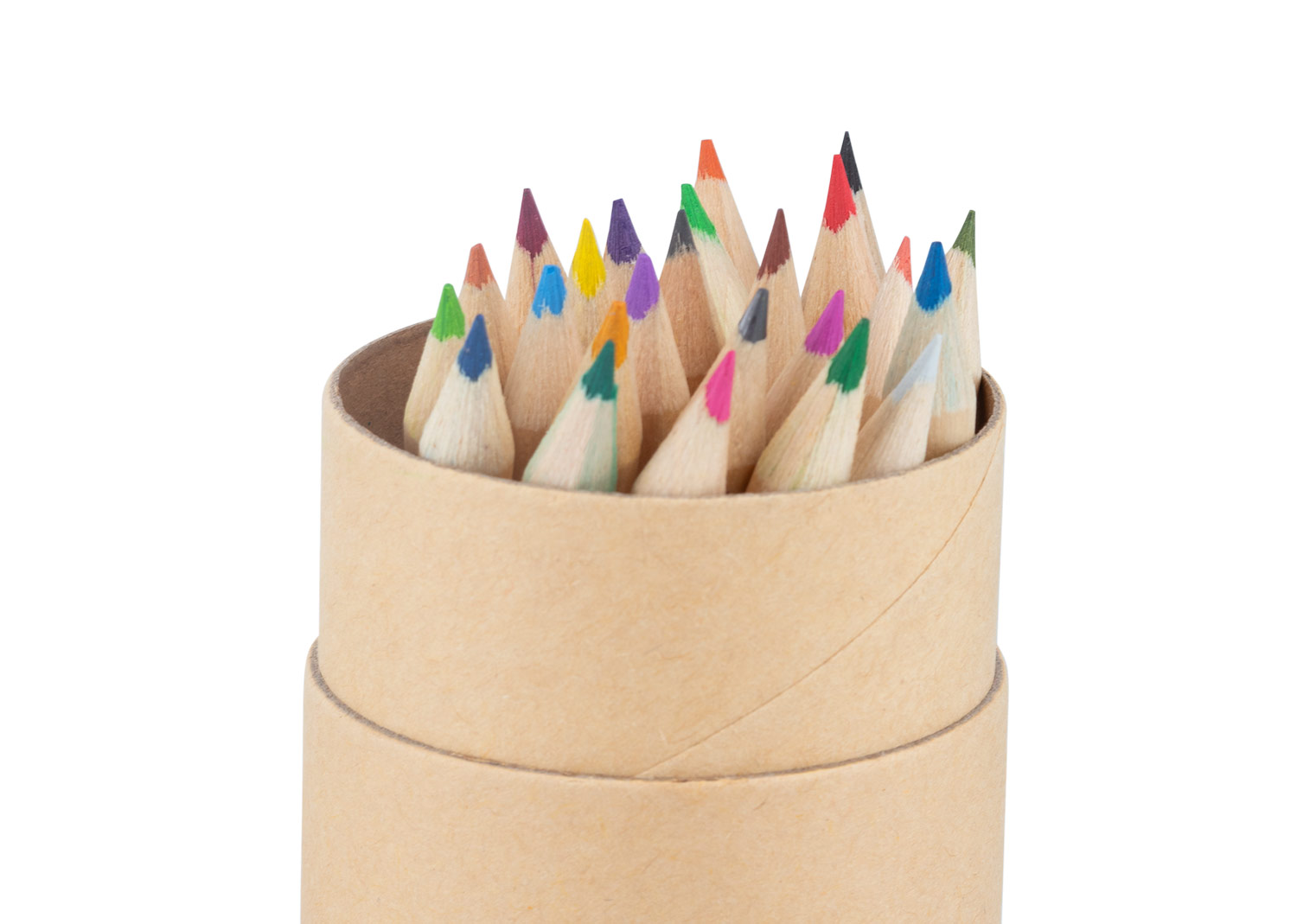 ste juego incluye 24 lápices de colores (8,7 X Ø 0,3) presentados en una caja de cartón, que además incorpora un sacapuntas (1,1 X Ø 2) y una goma de borrar (3,6 X 1,9 X 1,3) en su interior. Es una solución práctica y completa para actividades creativas, ideal para mantener todo lo necesario en un solo empaque.