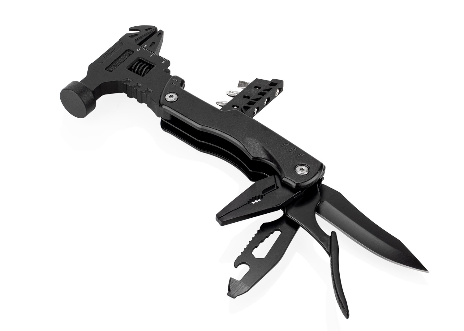 Esta herramienta multifunción integra en un solo cuerpo (8,5 X 26 X 2,4) compacto (8,5 X 16,9 X 2,4) una variedad de funciones esenciales: martillo y llave inglesa (8,5 X 17,8), extractor de clavos, tres tipos de destornilladores (estrella, plana y prozidriv), cuchillo (2 X 18,8) y una herramienta adicional con destornillador de 3 mm, dos tipos de abrebotellas, sierra y cabeza hexagonal en cinco tamaños (2 X 18,8). También incluye una pinza con punta de aguja, pinza regular y cortador de alambre (2,2 X 17). Su diseño plegable permite un fácil almacenamiento y transporte, e incluye un estuche para mayor practicidad.