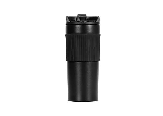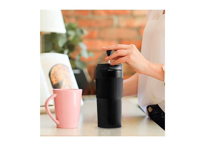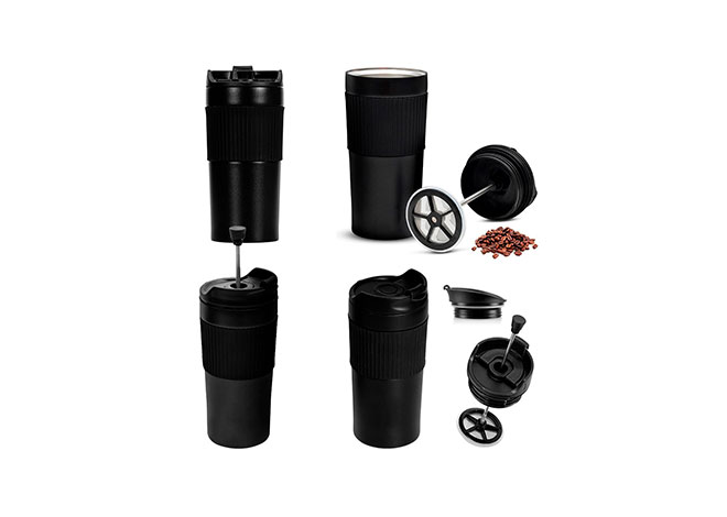 Mug 400 ml doble pared en acero inoxidable con aislamiento térmico para bebidas calientes de hasta 8 horas. Tapa con prensa francesa para preparar café. Cuerpo con aro en silicona.