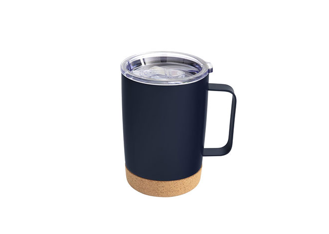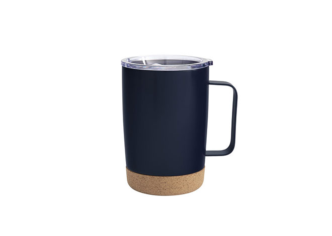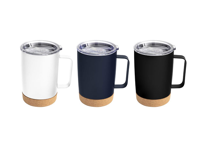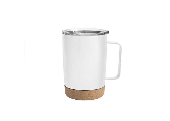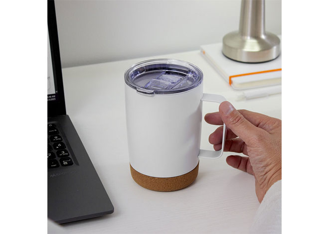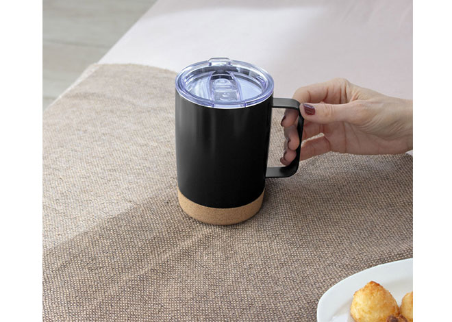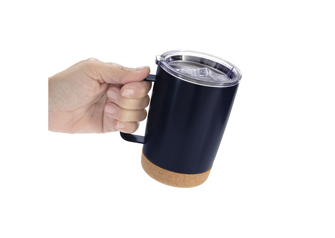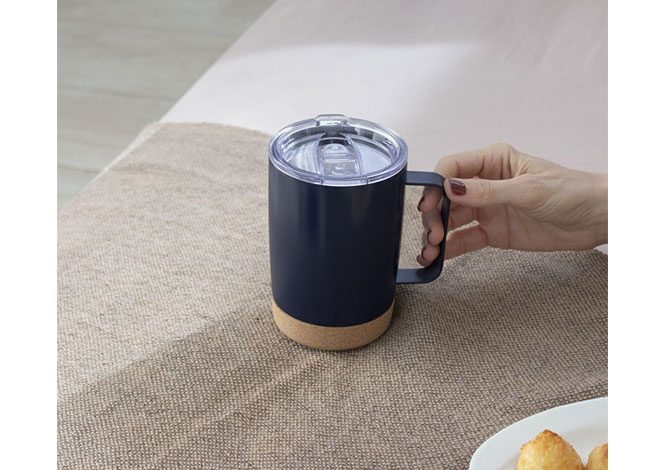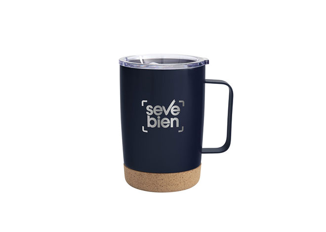 Mug doble pared con asa, sellado al vacío. Mug con aislamiento térmico. Tecnología vacuum. Interior en acero 304 y exterior en acero 201. Tapa de poliestireno con anillo de silicona. Asa metálica. Base de corcho. Pintura acabado semi mate. Mantiene hasta 12 hs la temperatura de las bebidas calientes y 24 hs de las bebidas frías.