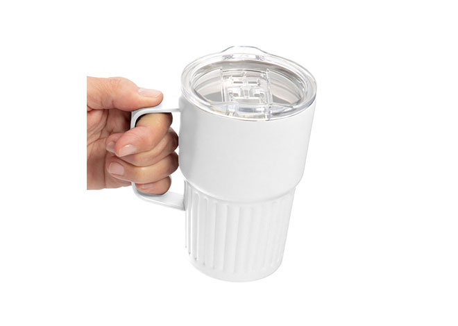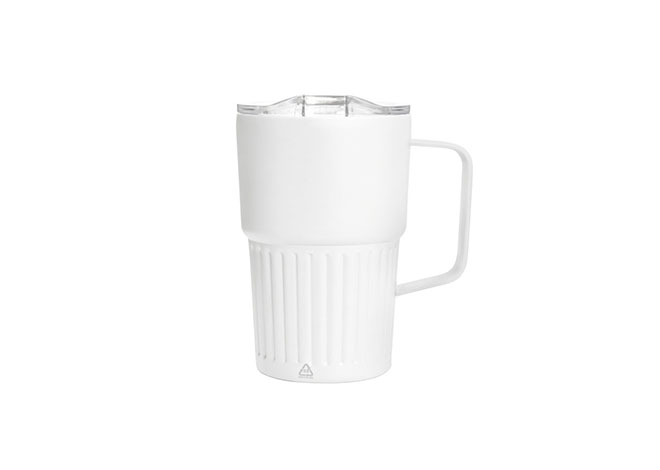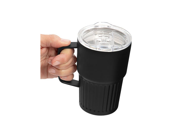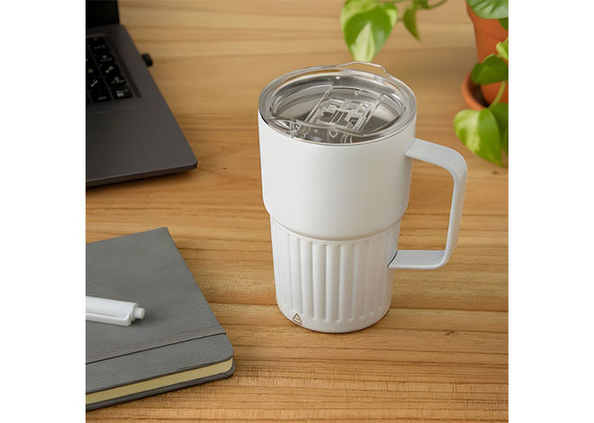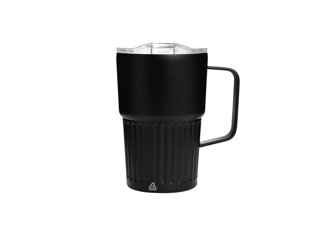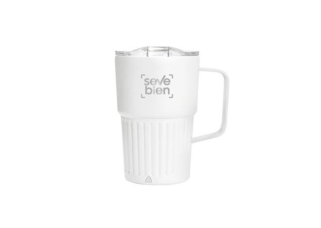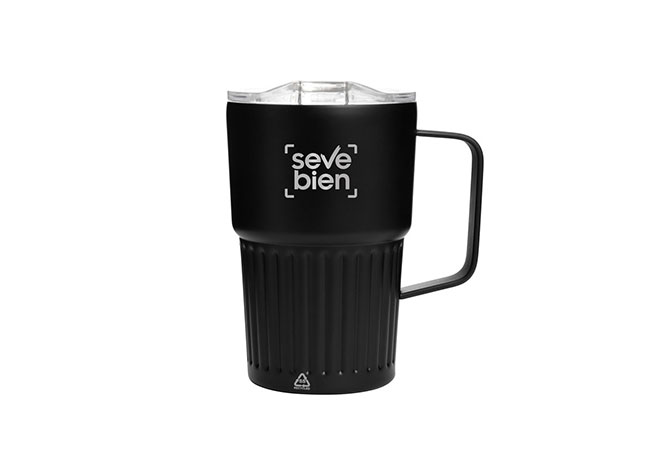 Mug doble pared con asa, sellado al vacío. Mug con aislamiento térmico. Tecnología vacuum. Interior en acero 304 reciclado y exterior en acero 201. Tapa de poliestireno con anillo de silicona. Asa metálica. Pintura acabado semi mate. Parte inferior texturizada. Mantiene hasta 12 hs la temperatura de las bebidas calientes y 24 hs de las bebidas frías.