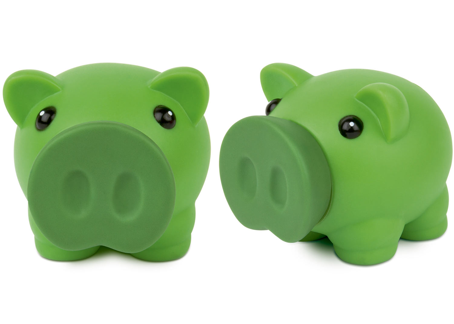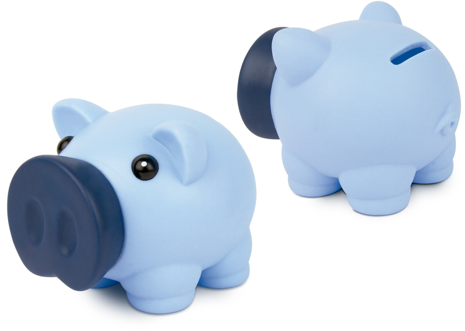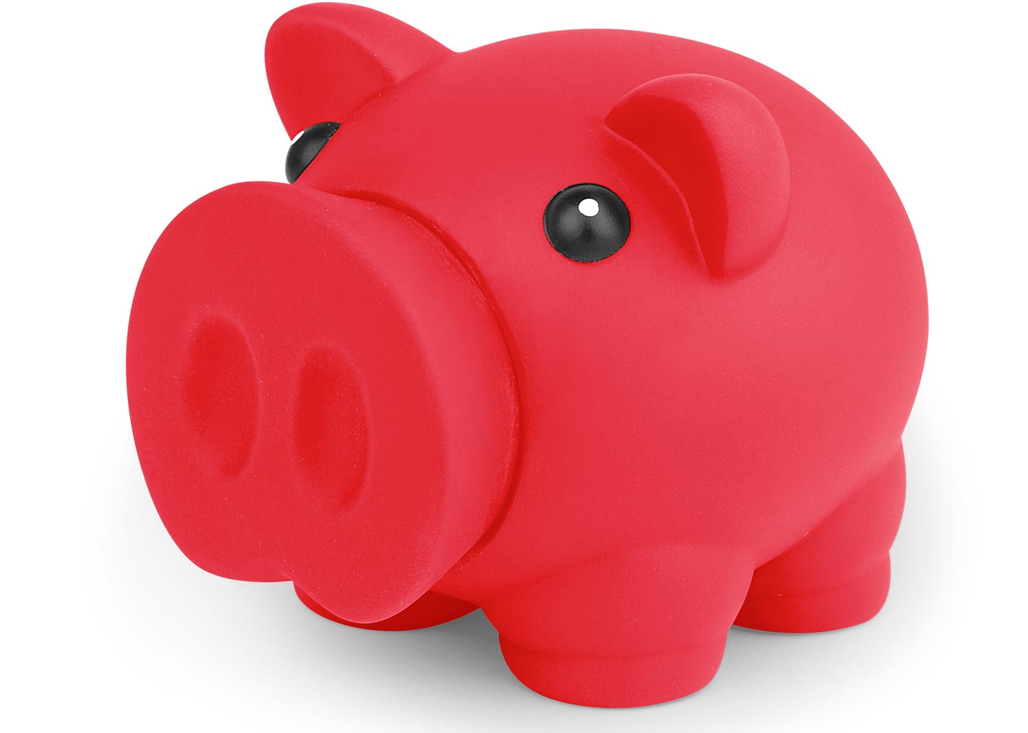 Alcancía en forma de cerdito. La naríz funciona como tapón para vaciar la alcancía.
