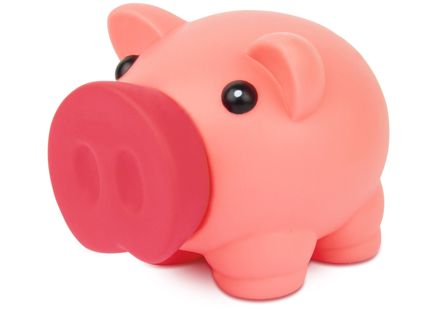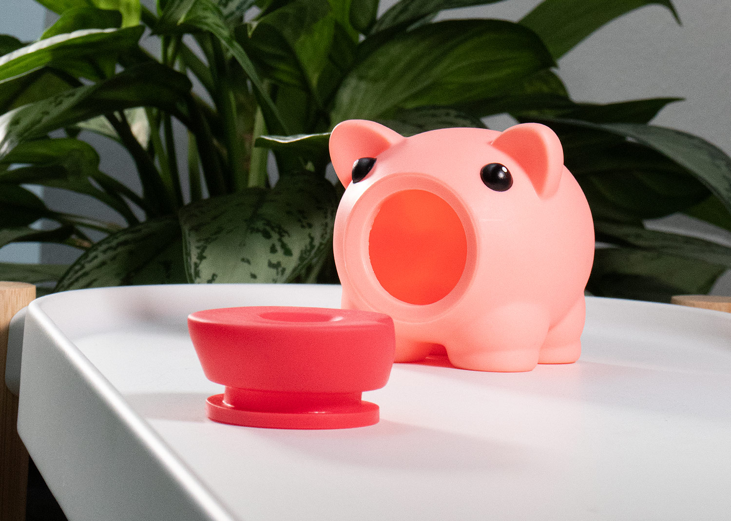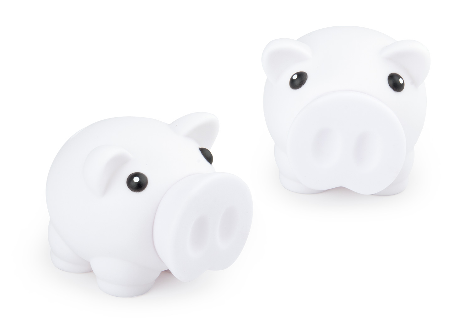 Alcancía en forma de cerdito. La naríz funciona como tapón para vaciar la alcancía.