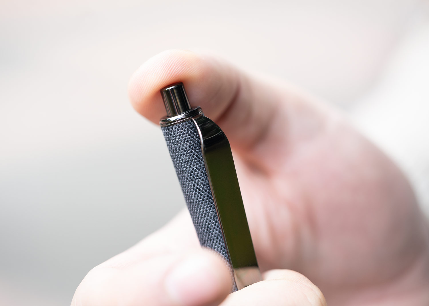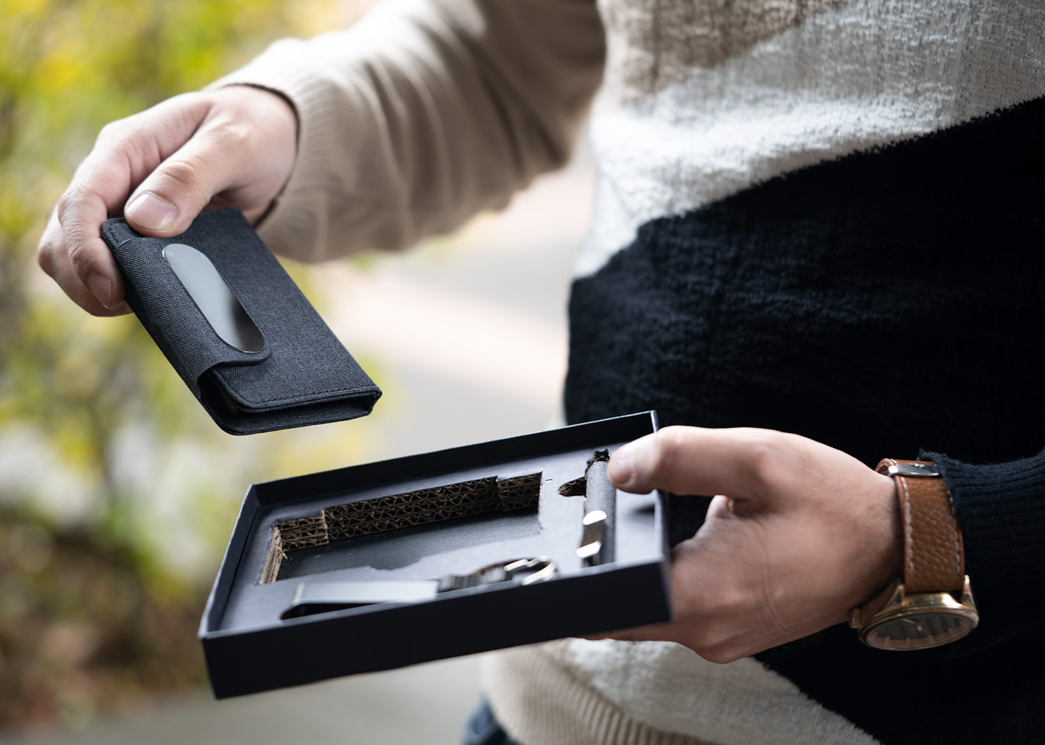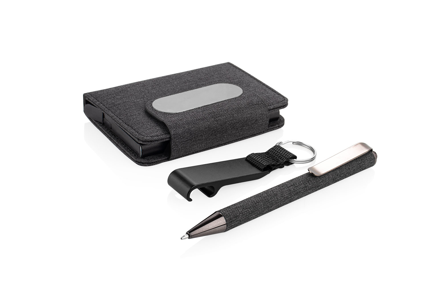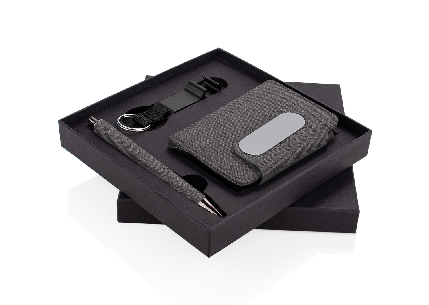 Set de oficina elegante y sostenible. Incluye tarjetero metálico forrado en tela RPET, bolígrafo de aluminio con detalle textil y llavero a juego, todo presentado en una caja de diseño sofisticado. Ideal para regalo corporativo.