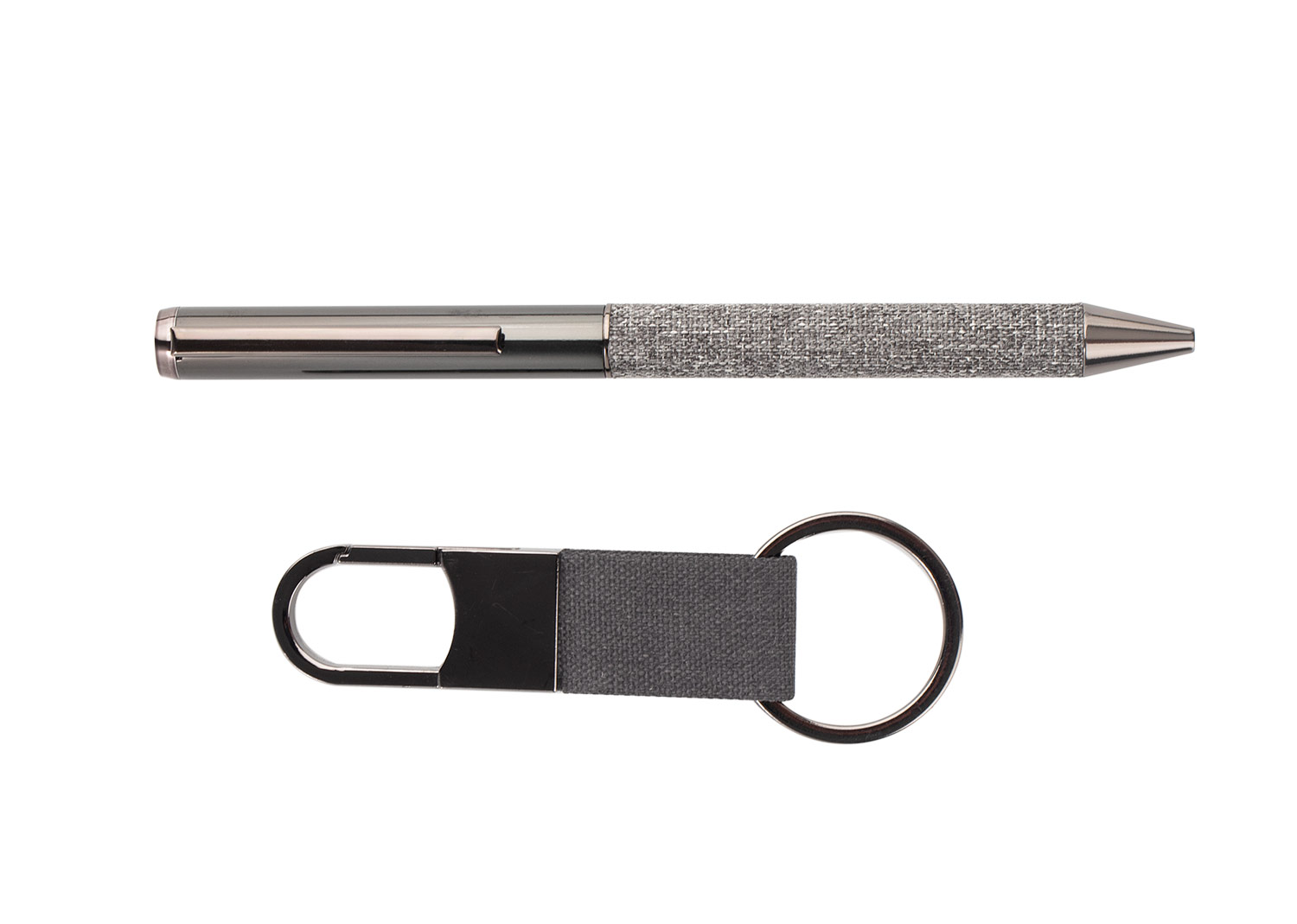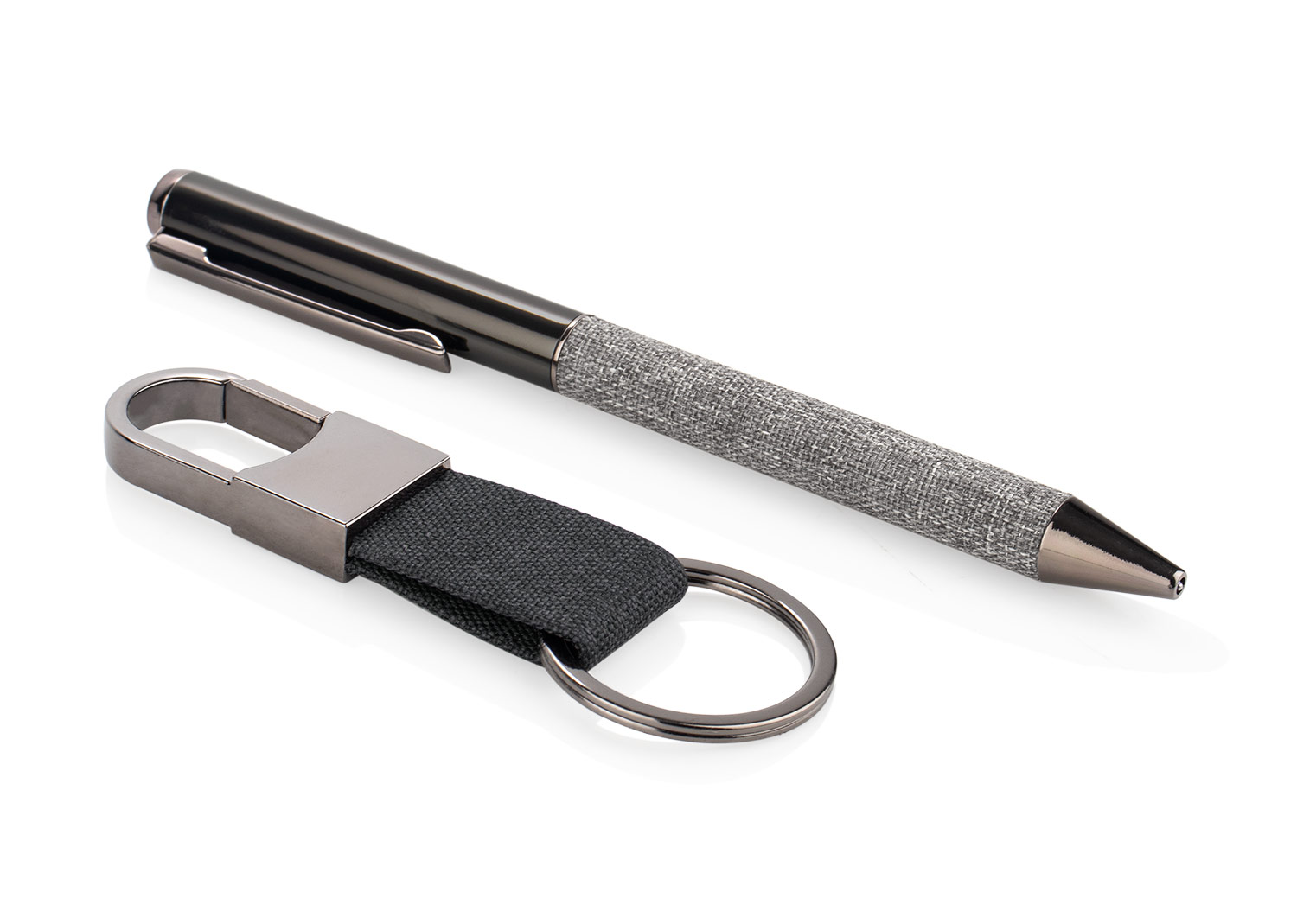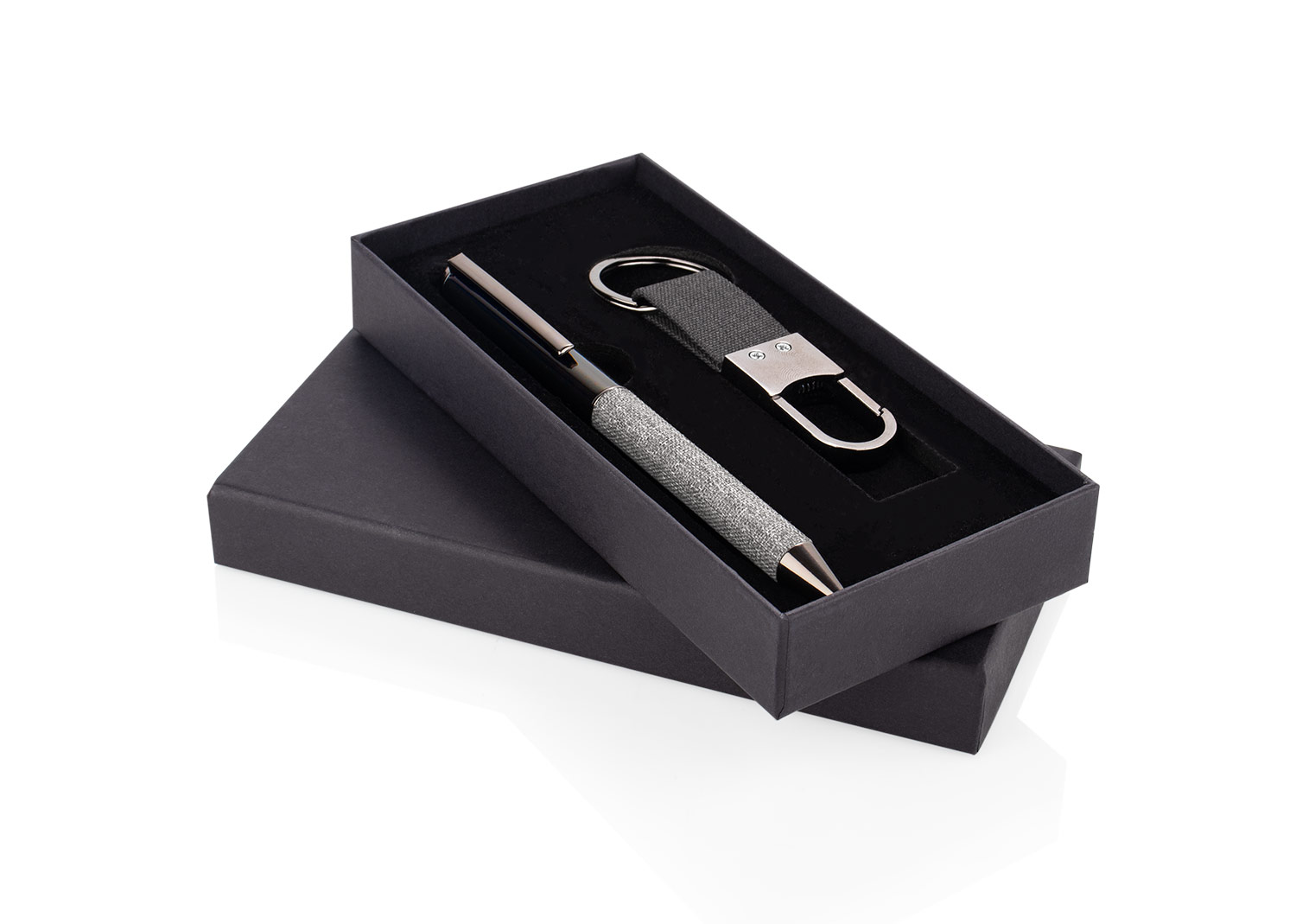 Set de bolígrafo y llavero con acabado ecológico y parte interna de gamusa. Incluye bolígrafo de aluminio y llavero forrado en tela RPET, presentados en una elegante caja de regalo negra. Una opción práctica y con conciencia ambiental.