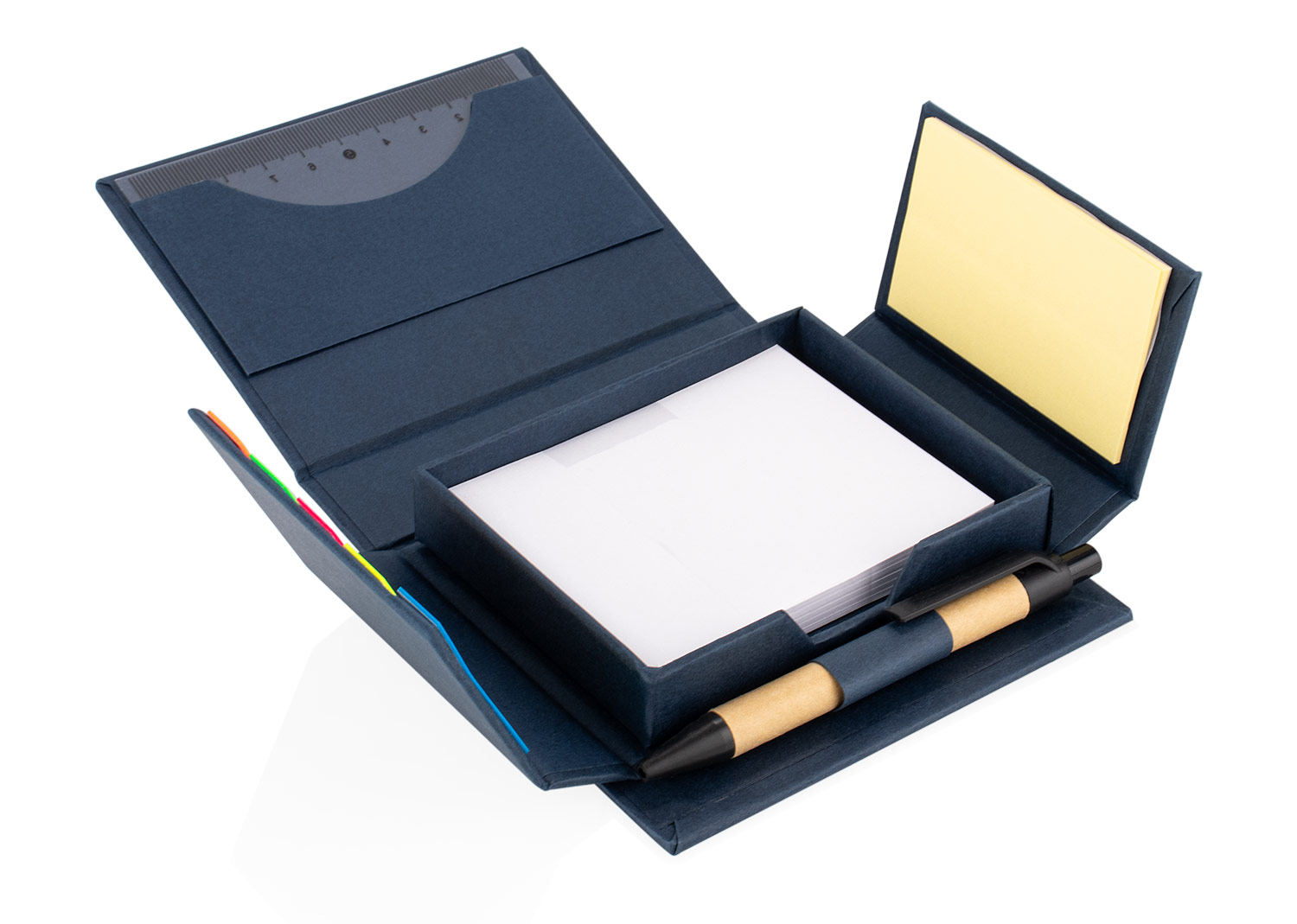 Set de escritorio presentado en elegante estuche rígido. Incluye regla de PP (10), mini nota adhesiva (5 X 10), notas adhesivas amarillas de 15 hojas, bloc de notas blanco de 100 hojas y bolígrafo retráctil de papel. Un conjunto práctico y organizado para el día a día.