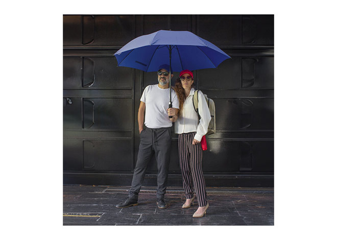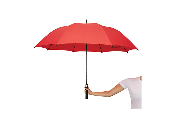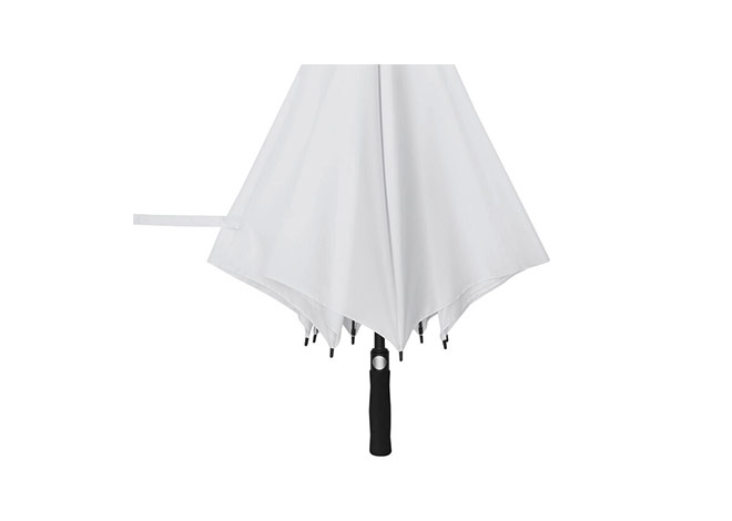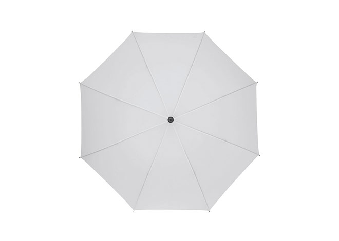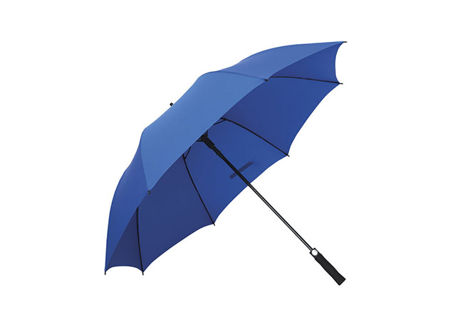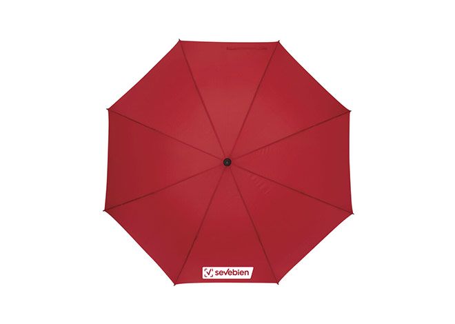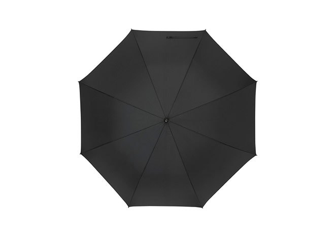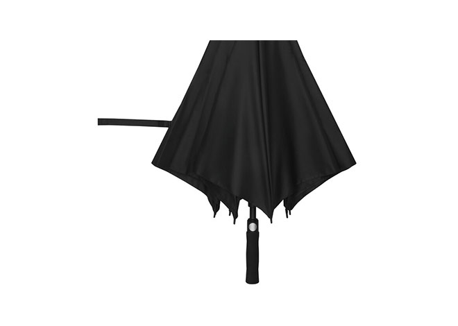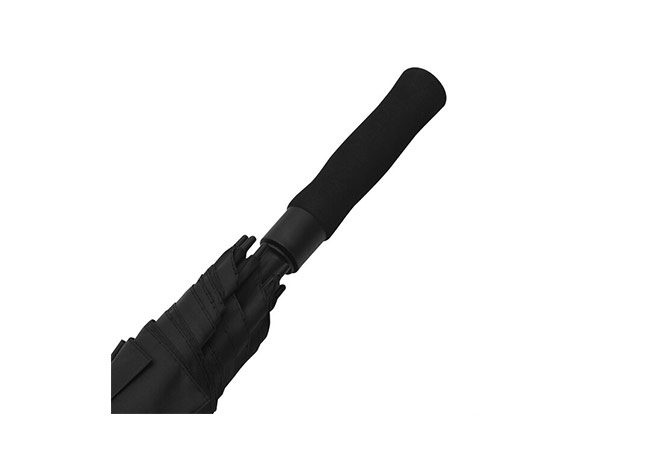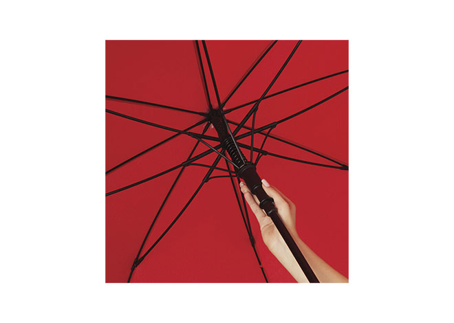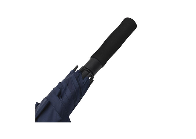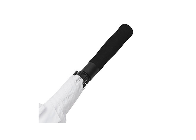 Paraguas APERTURA AUTOMATICA Y CIERRE MANUAL. Eje metálico y varillas en fibra de vidrio. Mango de eva color negro. Botón a presión. Cierre con correa de velcro.