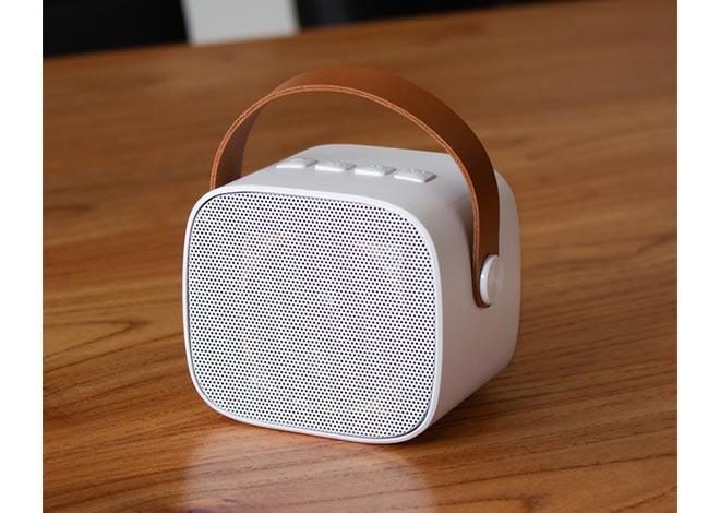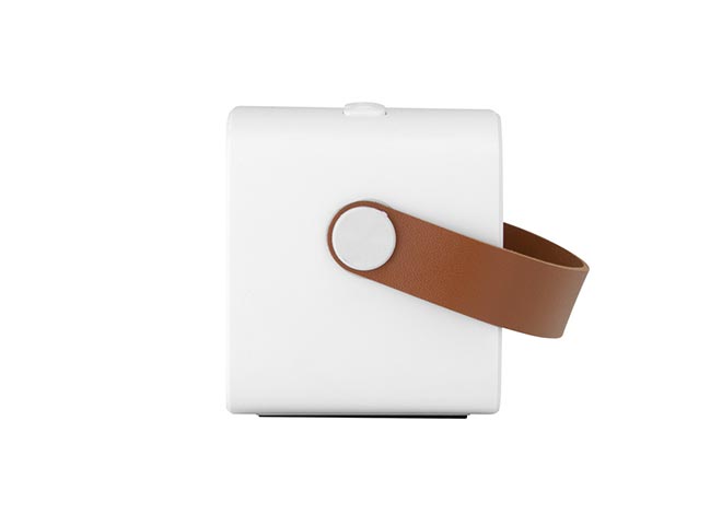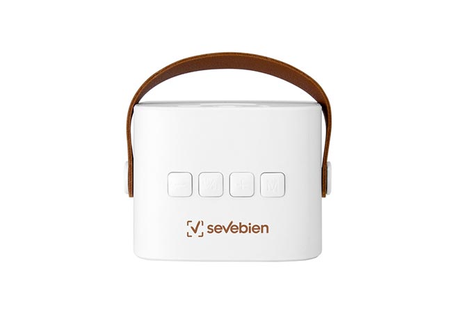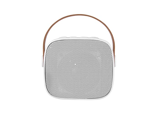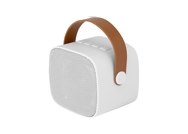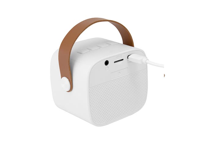 Parlante Bluetooth estéreo con Radio FM, tarjeta TF y entrada AUX. Estructura plástica color blanco y asa en poliuretano color marrón. Cable de carga y conexión USB-C en color blanco. Incluye manual de uso.