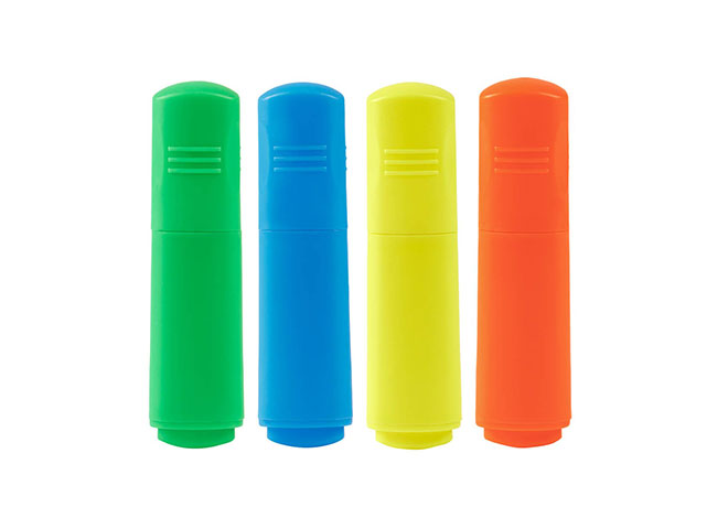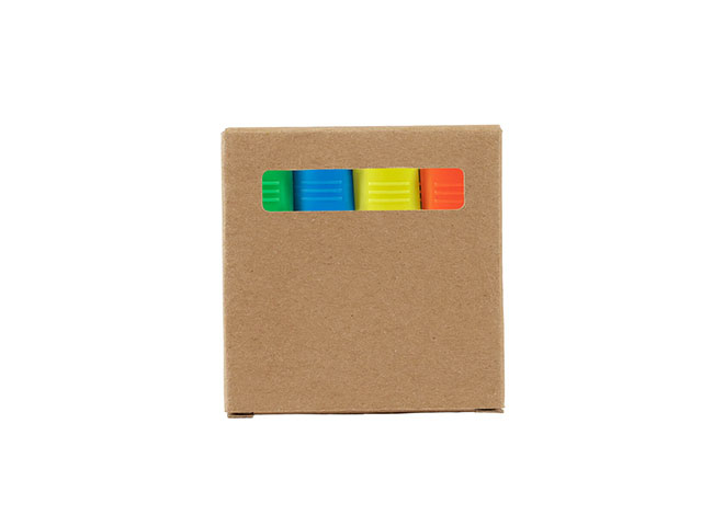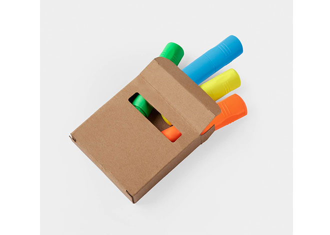 Descripción: Incluye 4 marcatextos en colores azul, amarillo, verde y naranja, en un practico estuche ecológico con ventana. Diseño compacto, ideal para oficina o escuela.