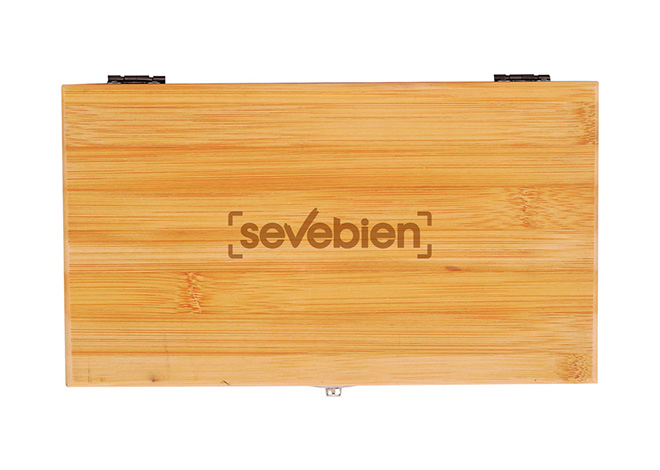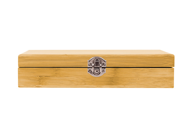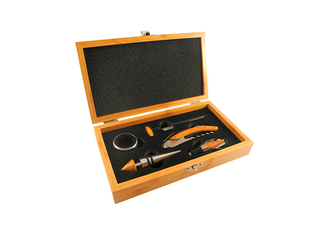 23 x 13 x 5 cm. Caja de bambú, cierre metálico con set de 5 piezas de bar: Sacacorchos, Tapón, Termómetro, Anillo cortagota y Tapón vertedor.