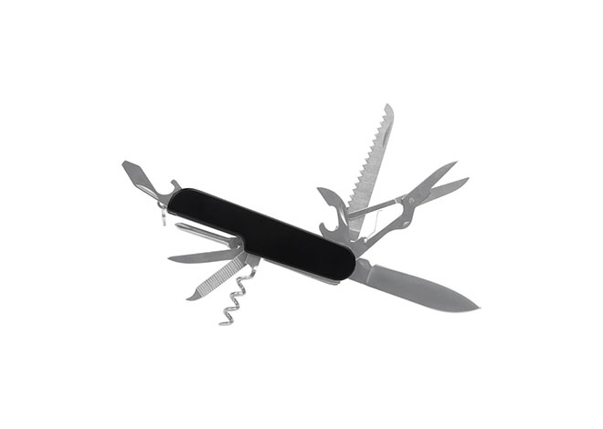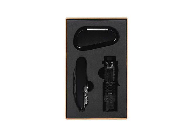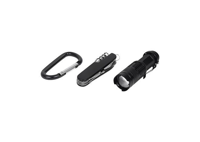 Descripción: Set de herramientas multiusos. Incluye gancho metálico, lampara con luz ajustable y navaja con 9 funciones: (navaja, sierra, tijeras, destapador, abrelatas, sacacorchos, guía de hilo, lima y desarmador de cruz). Incluye caja individual.