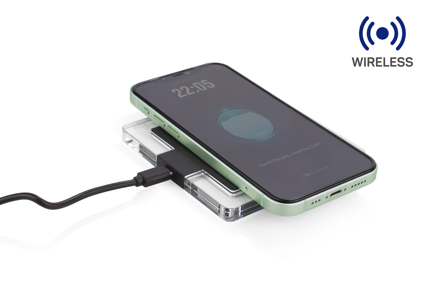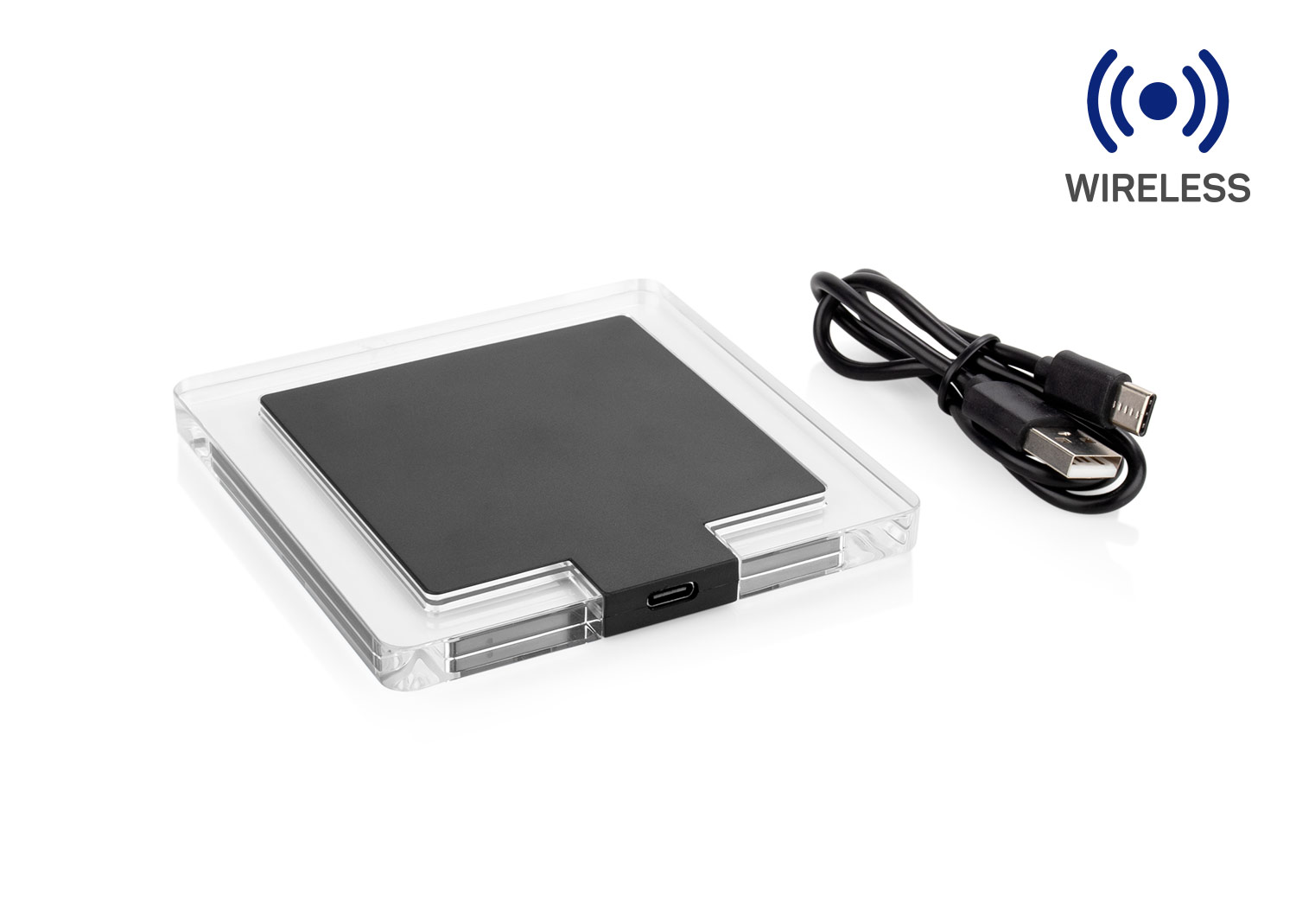 Cargador inalámbrico de 15 W con elegante diseño de bordes transparentes y superficie en contraste. Cuenta con entrada Tipo C para una carga estable y eficiente, compatible con dispositivos que soporten carga inalámbrica Qi. Ideal para mantener tu espacio de trabajo moderno y ordenado.