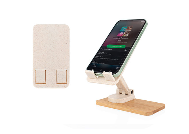 Soporte para teléfono elaborado con materiales ecológicos: base de bambú y estructura de paja de trigo. Ofrece rotación completa de 360° y ajuste de altura para mayor comodidad, además de contar con superficie antideslizante para garantizar estabilidad. Su diseño práctico y sostenible lo convierte en el accesorio ideal para escritorio o mesa.