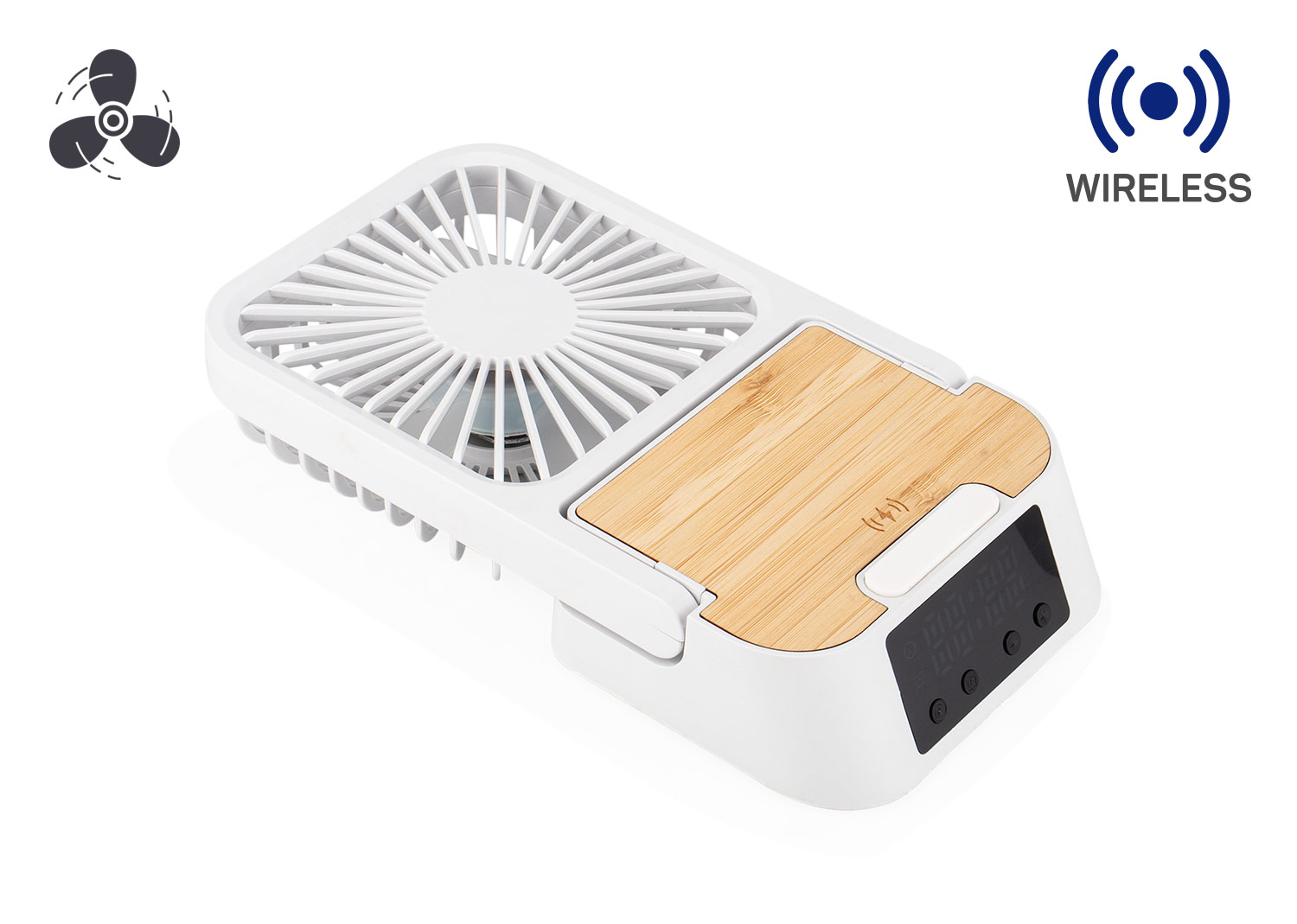 Ventilador de escritorio plegable con múltiples funciones integradas. Incorpora reloj con función de hora y alarma, ventilador de 3 velocidades y carga inalámbrica Qi con luz LED posterior que se ilumina en azul para confirmar una carga correcta. Funciona también como soporte para celular e incluye entrada y salida Tipo C, además de salida USB-A, ofreciendo practicidad y conectividad en un solo dispositivo.