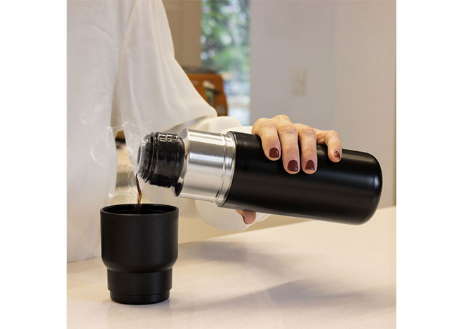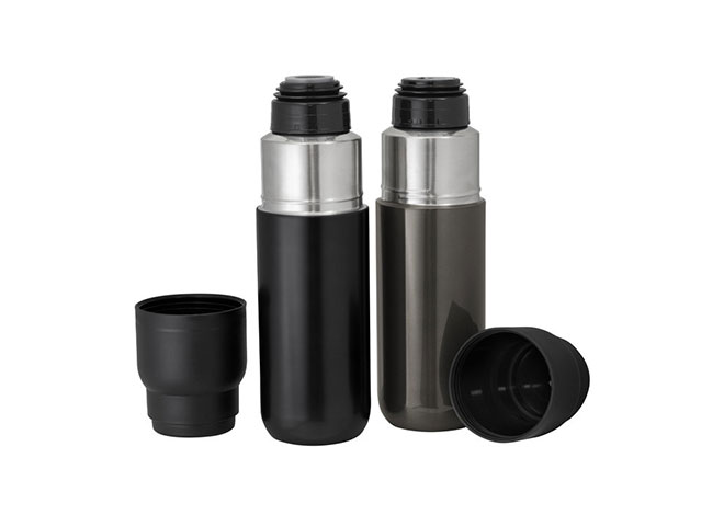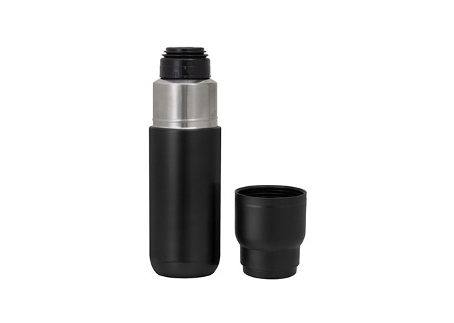 Termo con taza. Termo Doble pared sellado al vacío. Interior en acero 304 y exterior en acero 201. Tapa y taza plásticas a rosca color negro. Tapón con apertura y cierre a presión. Mantiene por más de 12 hs la temperatura de las bebidas calientes y 24 hs de las bebidas frías.