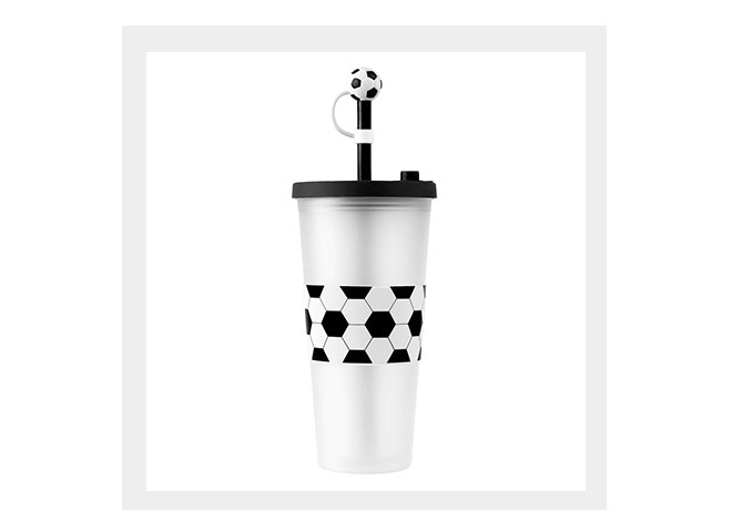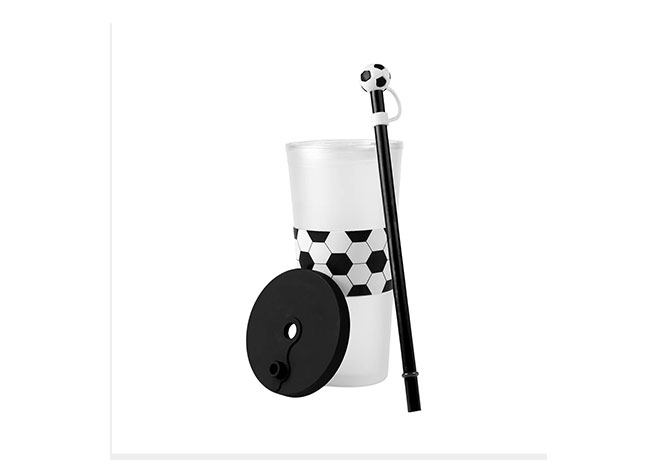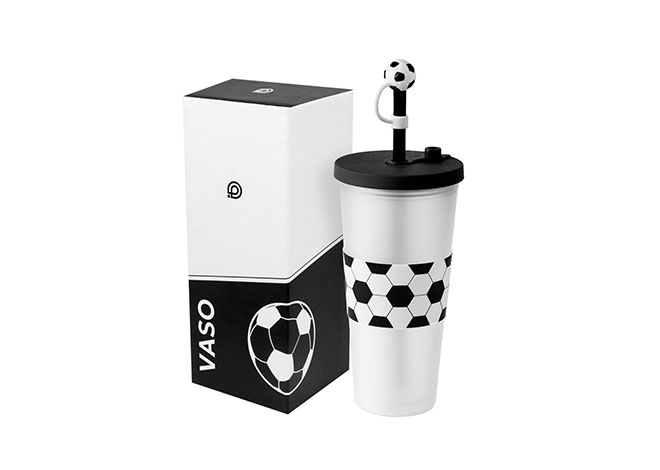 Descripción: Vaso doble pared de plástico. Acabado frosty suave al tacto y tapa de rosca. Cuenta con popote de plástico reutilizable y tapon de silicon en forma de balón. Su original diseño con manga de silicón antideslizante, garantiza un agarre cómodo y seguro. Capacidad 23 Oz. Base de 6.4 cm de diámetro. Caja individual incluida.